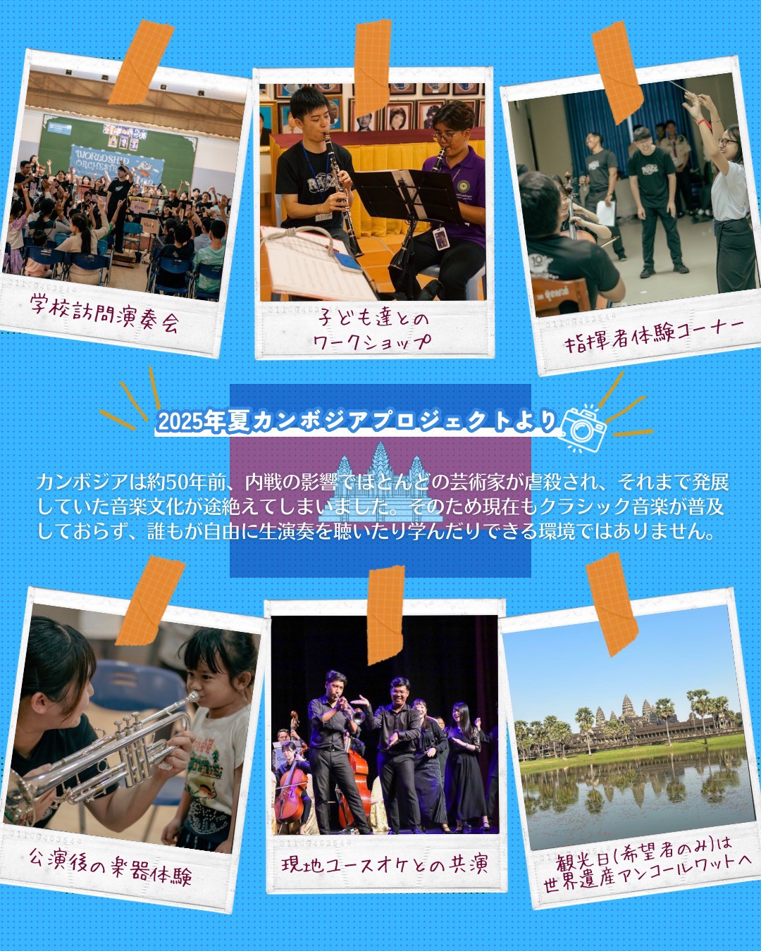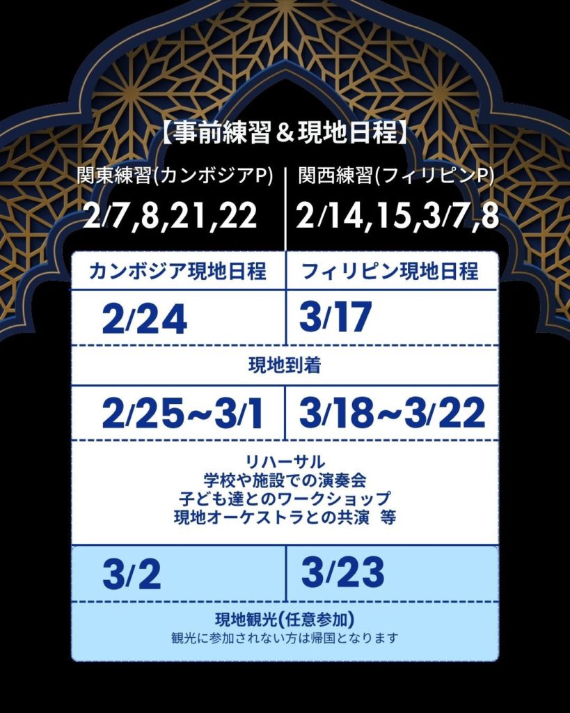 午前:学校訪問演奏会(予定) 午後:カンボジアの歴史を知るコーナー(予定) 夕刻:現地共演団体との合同練習 |